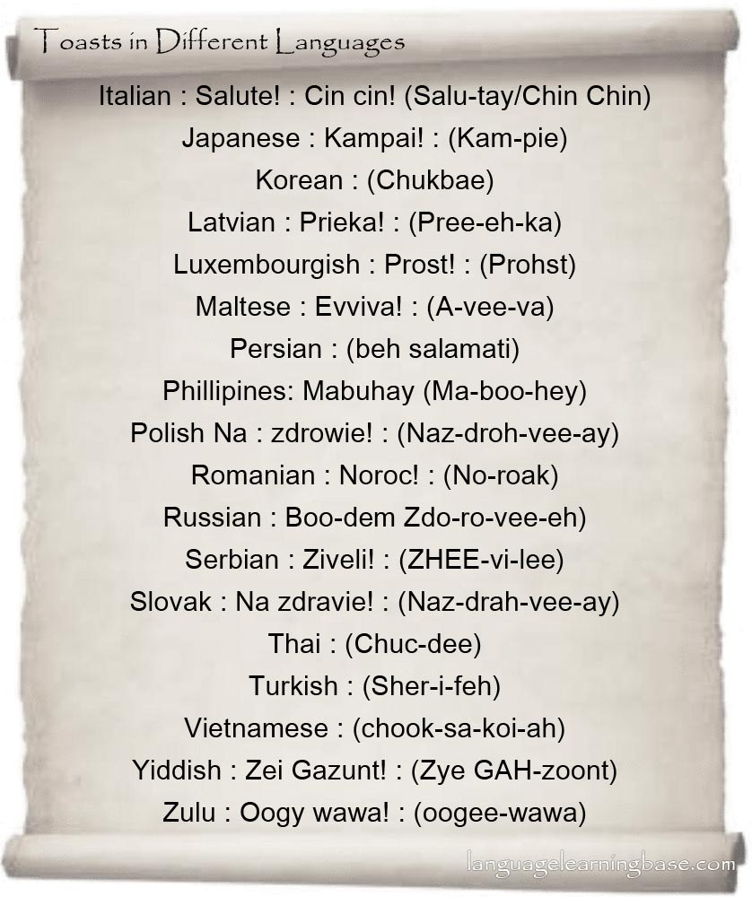 When traveling to a foreign country, learning basic phrases in the local language is always a plus. Similar to the spanish translation, the most important word in the french language is 'sante.' zulu. Check out the infographic below to see all the ways you can use another word for cheers when drinking. We've compiled a list of how to say "cheers" in 31 different languages, to guide you in the next country you visit. While there are only around 36 million .